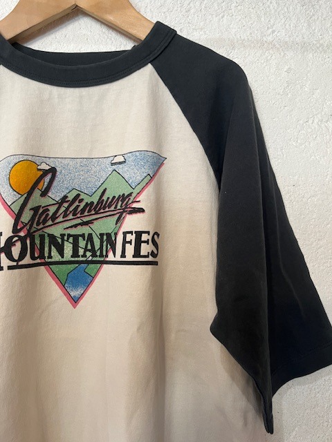 ヴィンテージ感のある配色のラグラン袖の7分袖tシャツ。