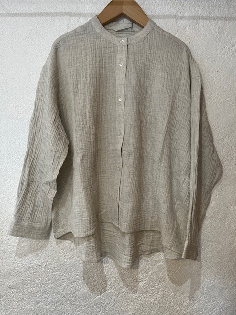 杢調カラーのダブルガーゼ素材の前開きシャツ。