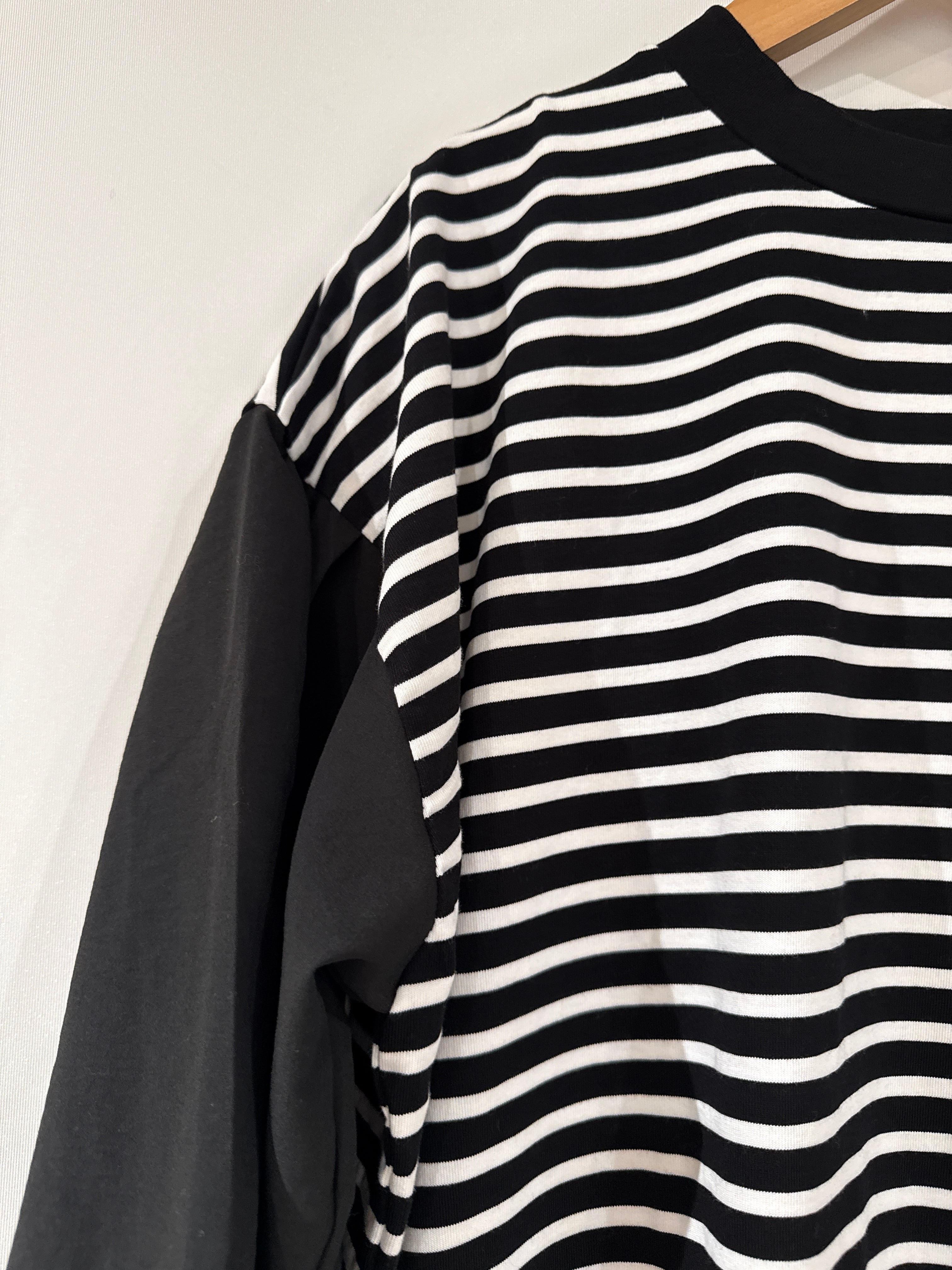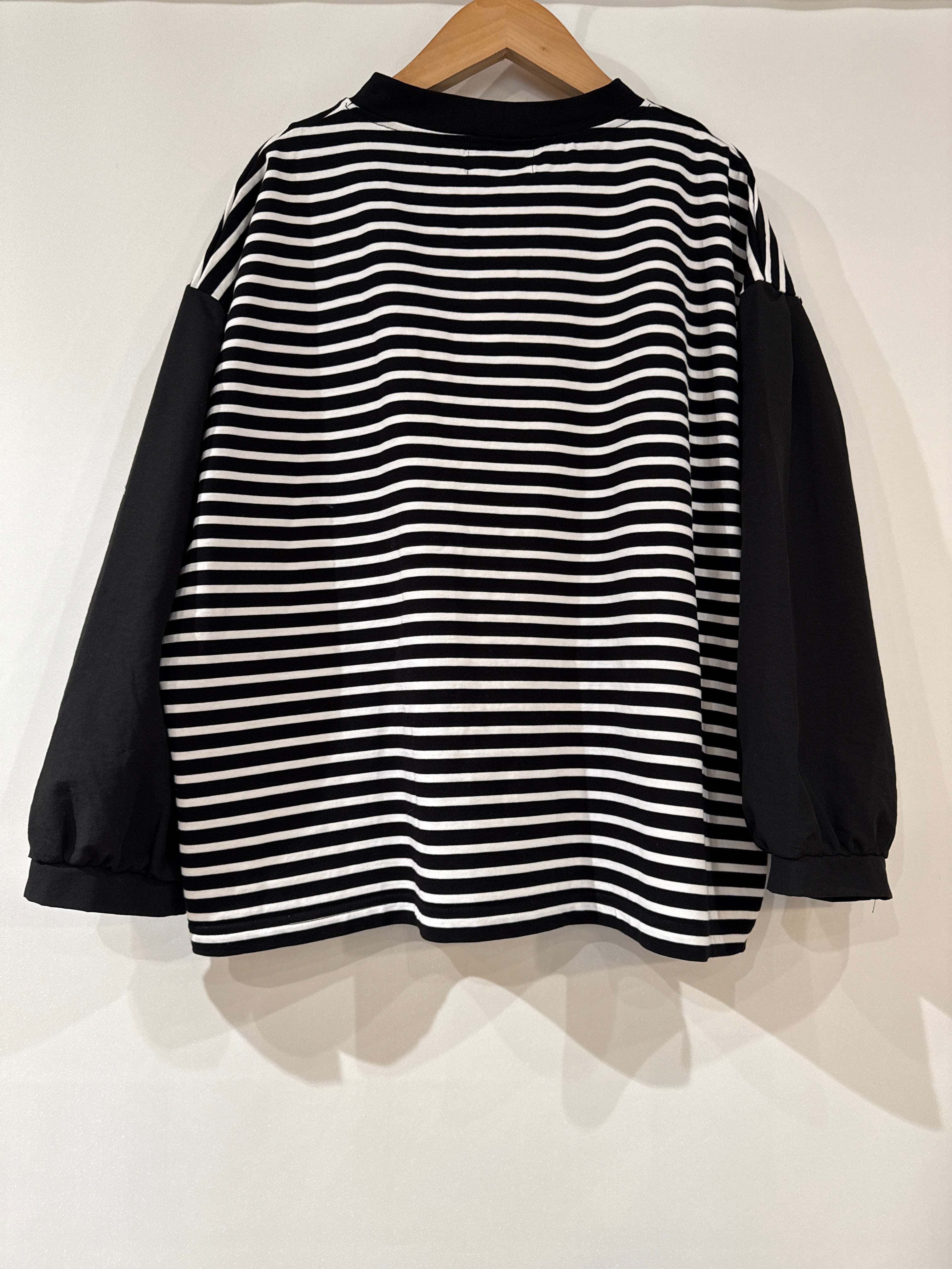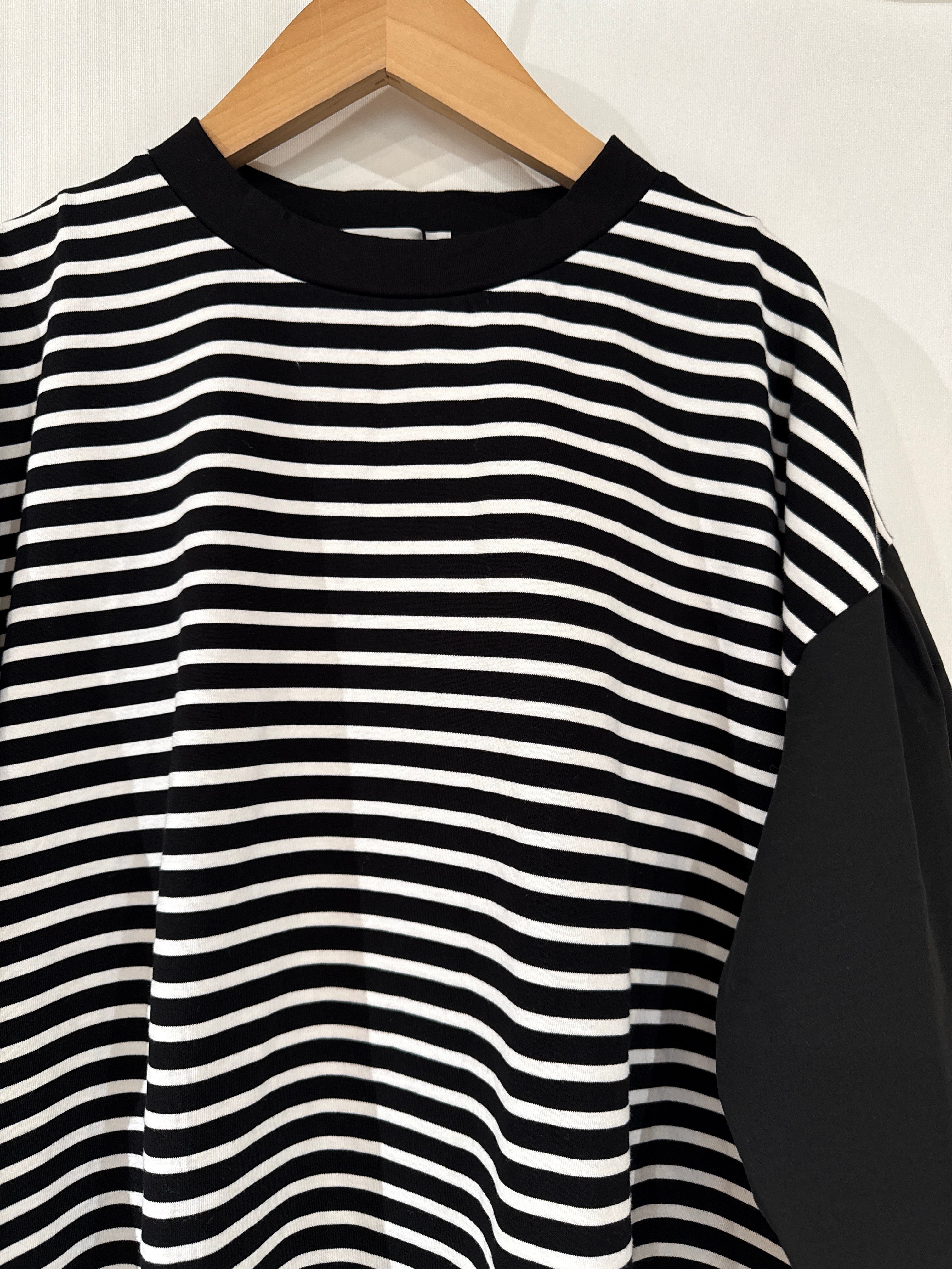 しっかりめのボーダー生地と袖の布帛(ブラウス生地)で