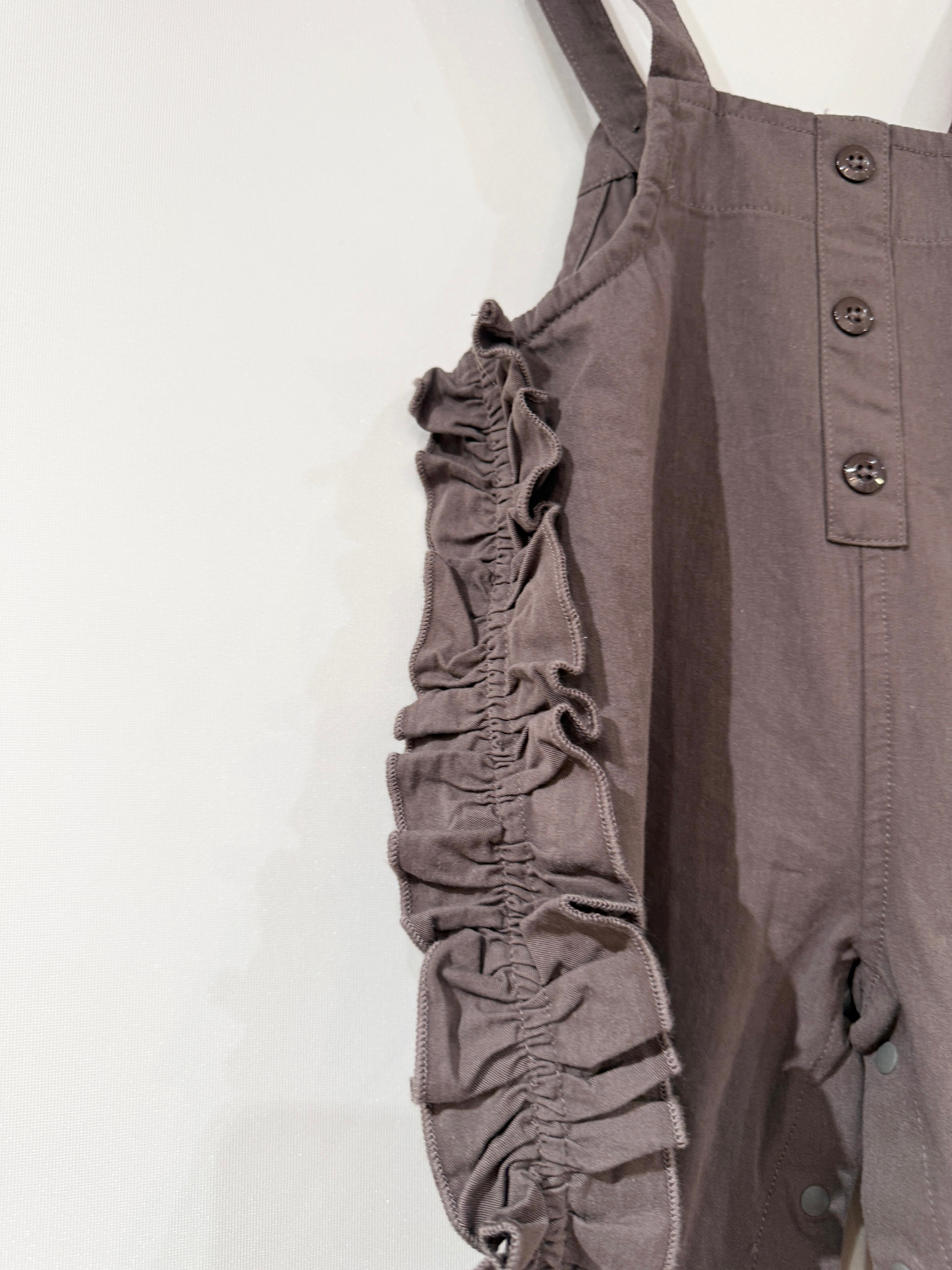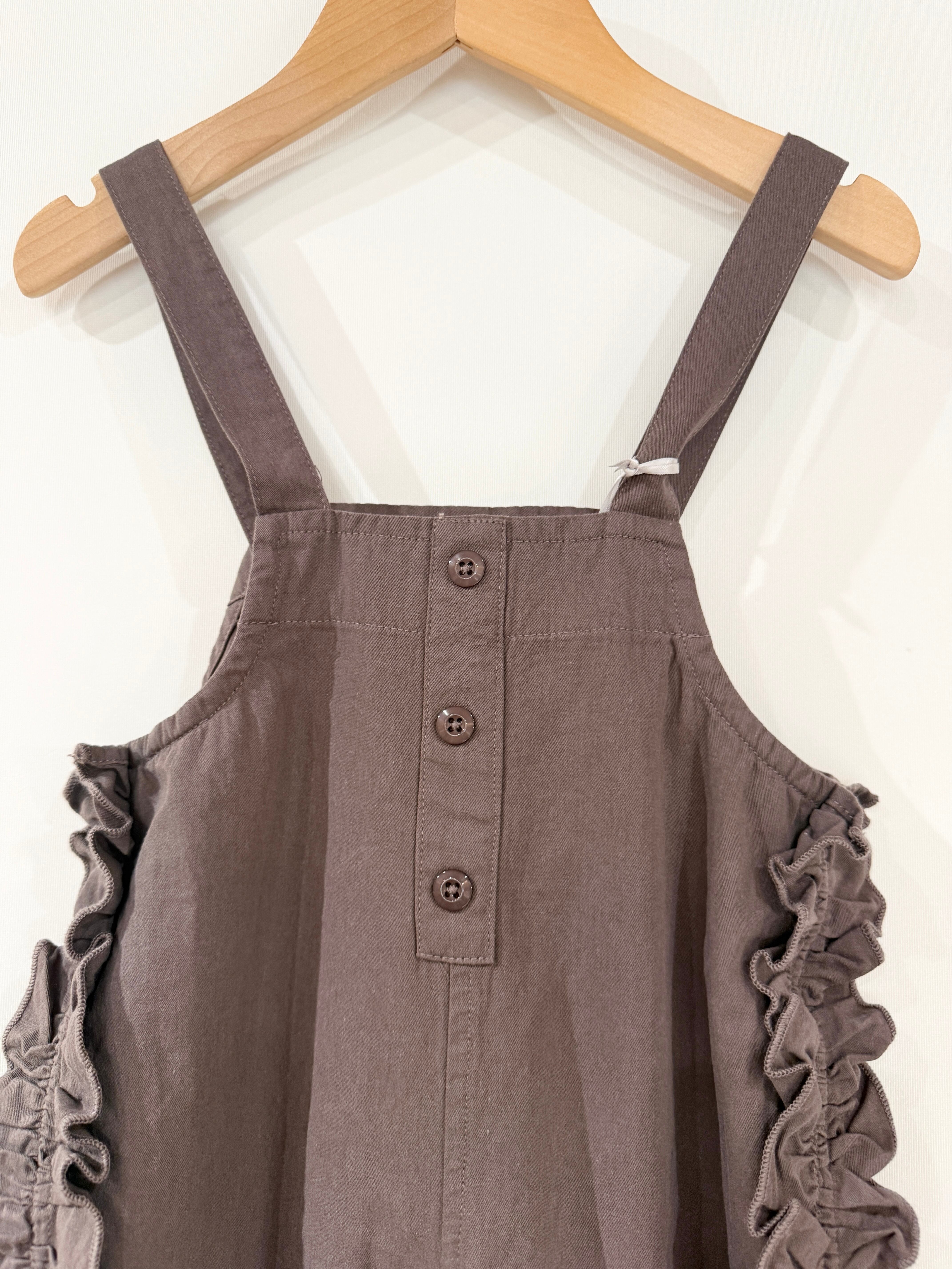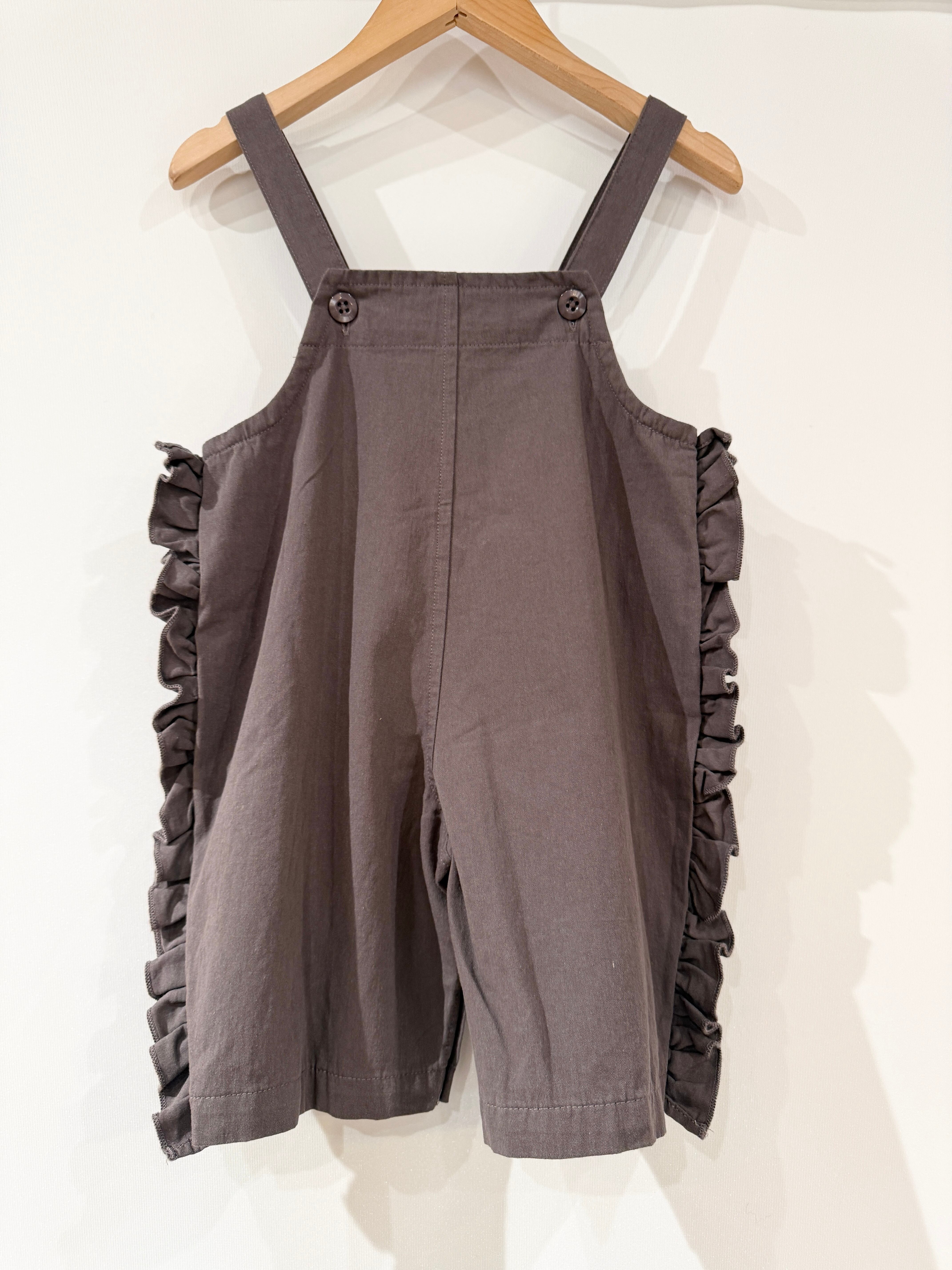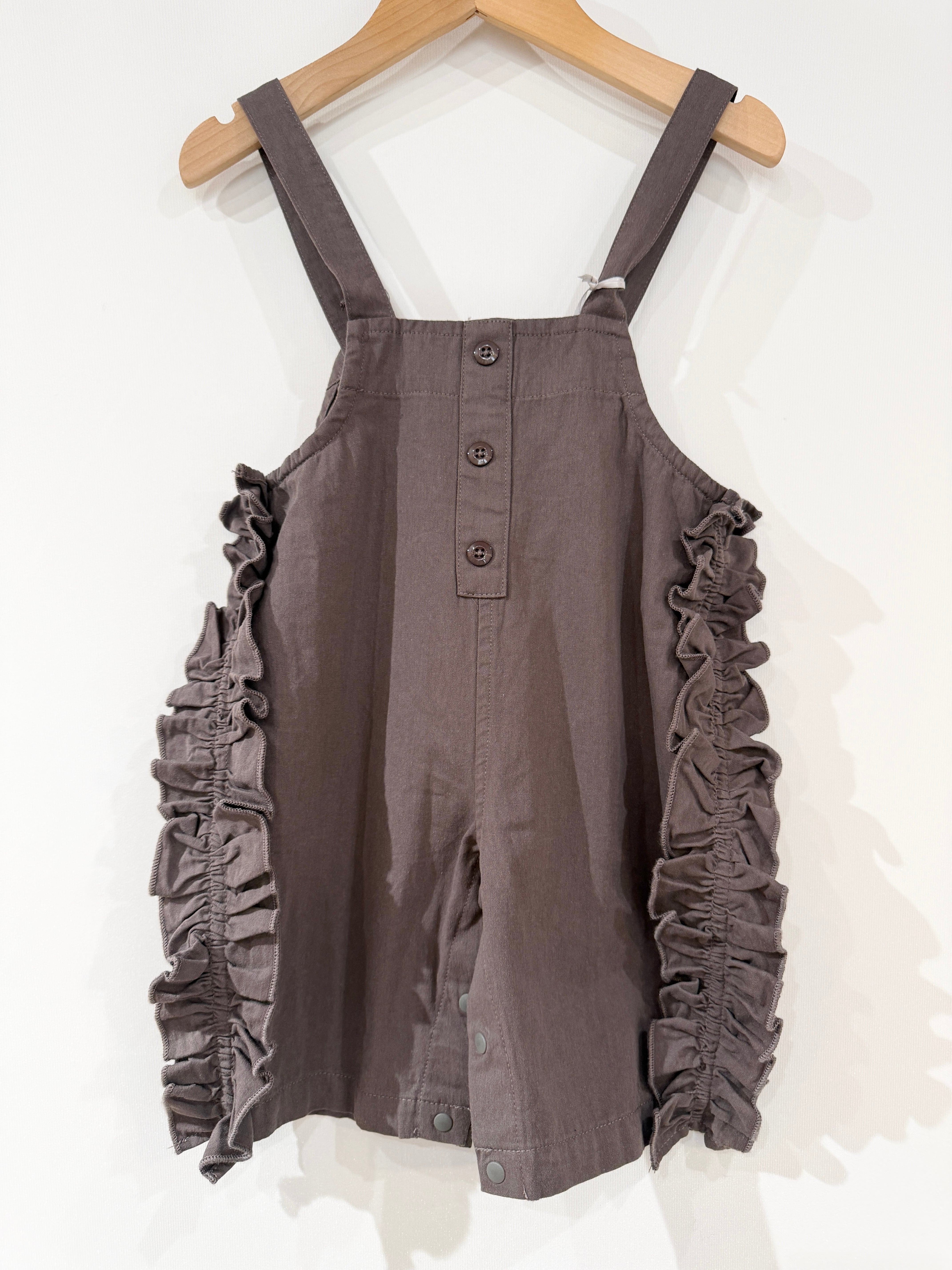 サイドのフリルが特徴的な、丸いフォルムが可愛いサロペット。